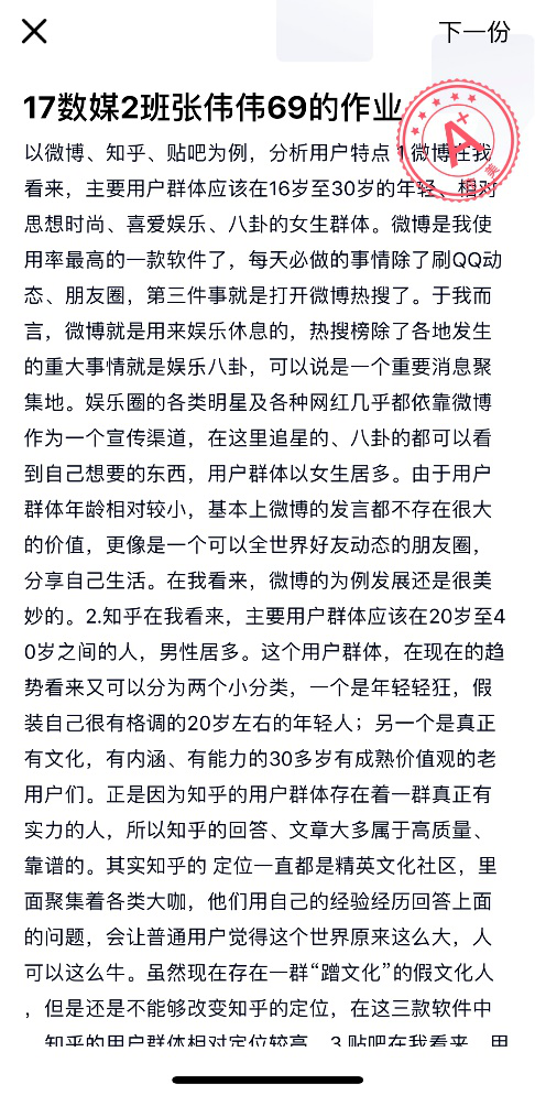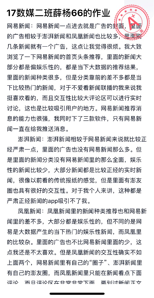 以下关于“新旧媒介的用户比较”作业充分显现了本课程的教学特点,学生在写作过程中,能够深入剖析论文选题,建构论述框架,阐明核心观点,辅助论据支撑,显示出了积极的学习态度和学术素养。