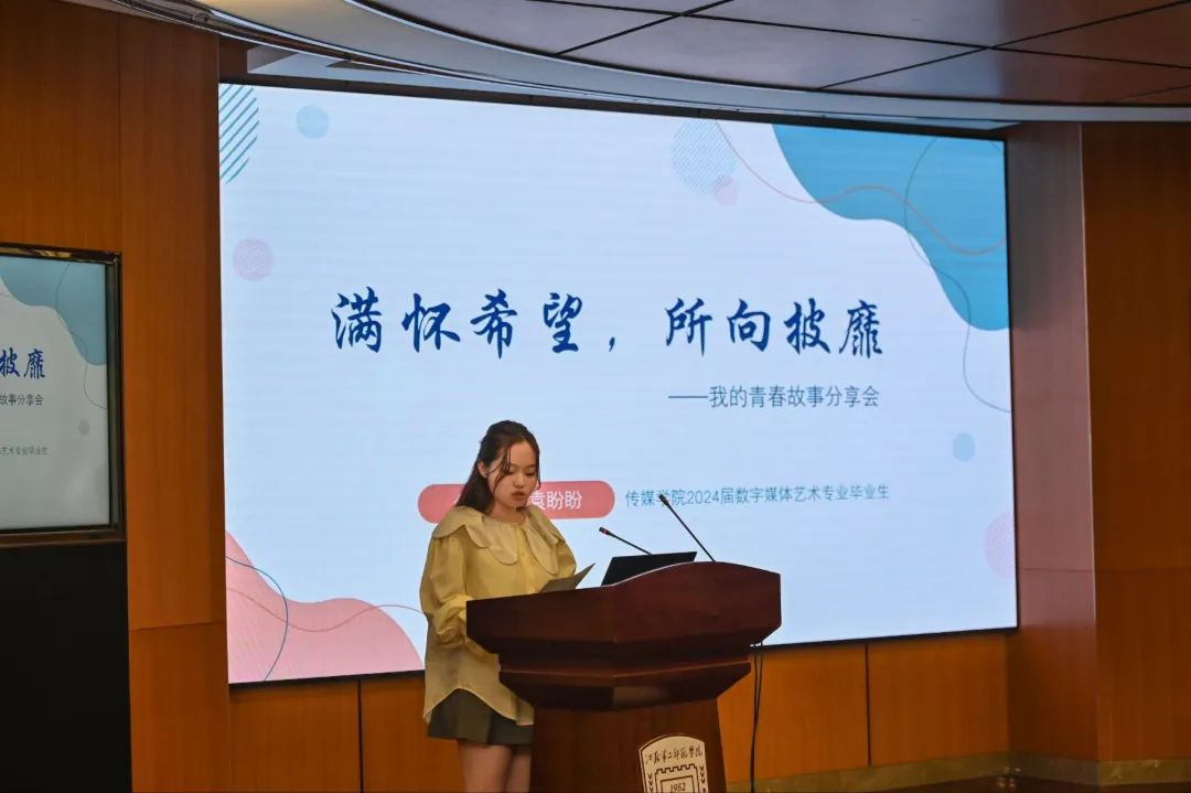 为给新生树立良好的职业规划意识,并充分发挥学生先进典型和优秀校友的示范引领作用,传媒学院于9月19日在草场门校区举办了一场别开生面的青春故事分享会。2024届数字媒体艺术专业毕业生袁盼盼受学院邀请重返校园,她以“满怀希望,所向披靡”为主题,向学弟学妹们深情讲述了自己在大学期间的成长经历与心路历程。