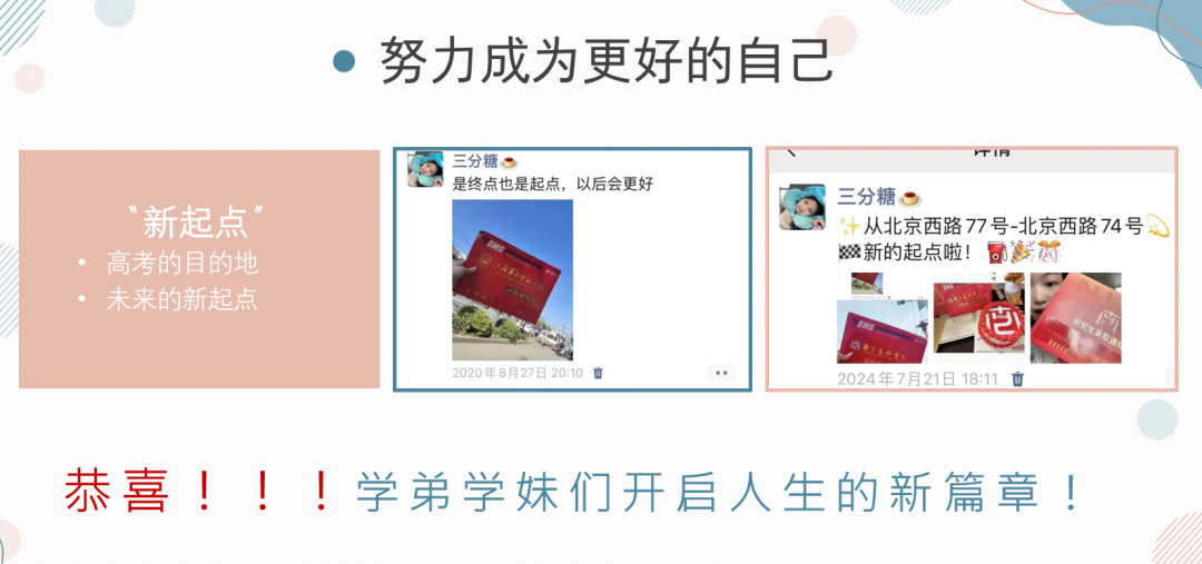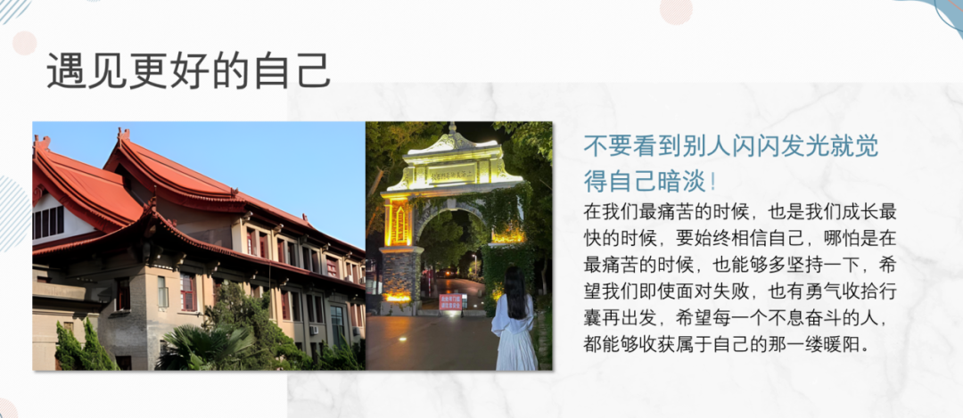 在分享中,袁盼盼深情地感谢了母校每一位恩师的悉心教导和无私帮助,也感谢了那个在困难面前不轻言放弃的自己。她回忆了在校园活动中的新奇体验、与朋友共度的美好时光以及为了小目标努力奋斗的日子。这些经历不仅丰富了她的大学生活,也让她更加明确了自己的方向和目标。