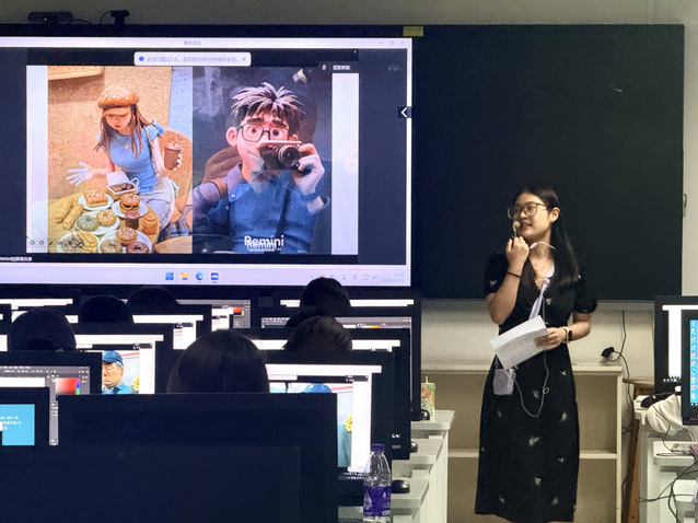 在“AI数字素描”课堂上,王泠然老师以“图灵测试”与“人机协作”为教学切入点,设计了多轮互动环节,包括AI生成图像演示、学生角色扮演与即兴创作活动。课堂气氛活跃,学生积极参与问答与创意实践,展现出人工智能辅助艺术创作的教学潜力。
